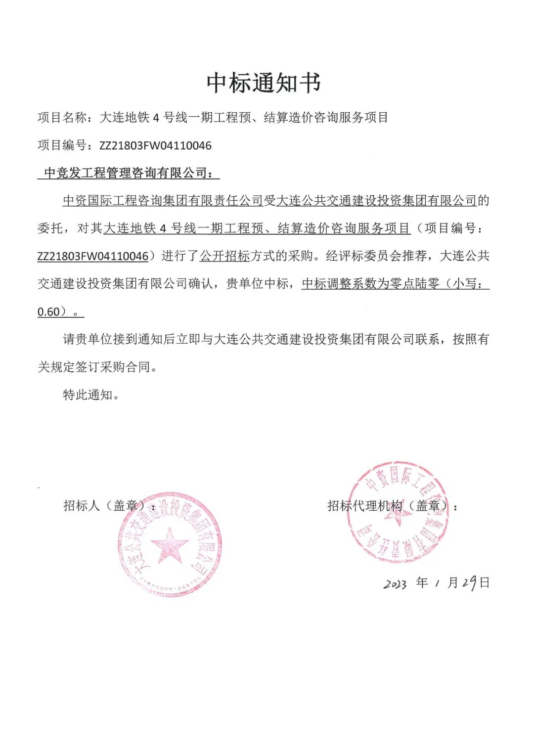 近日,中竞发大连分公司收到大连公共交通建设投资集团有限公司发出的中标通知书,中标大连地铁4号线一期预结算造价咨询服务项目,中标价格为500万左右。该项目是大连市重点交通运输项目之一,也是大连分公司继中标地铁13号线后,再一次中标大连公共交通建设投资集团有限公司的轨道交通项目。